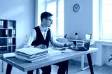 Portrait of young attractive business man in suit and glasses working at the desk with a pile of documents on his workplace looking at the laptop monitor screen at the office and typing.