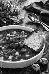 Beef vegetables goulash soup on wooden table