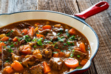 Beef goulash with vegetables in frying pan on wooden table