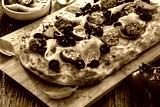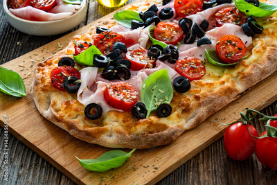 Pinsa Romana with mozzarella cheese, boiled ham, cherry tomatoes, black olives and basil leaves on wooden table