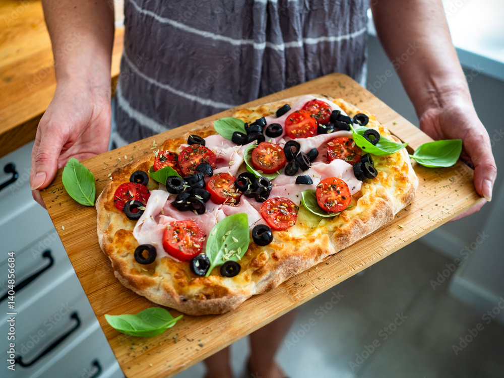 Woman holding wooden board with Pinsa Romana with mozzarella cheese, boiled ham, cherry tomatoes, black olives and basil leaves