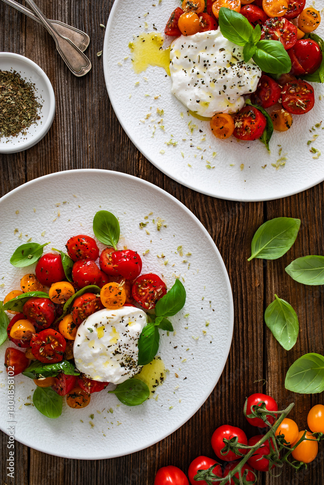 Caprese salad - tomatoes, fresh basil leaves and burrata cheese on wooden background