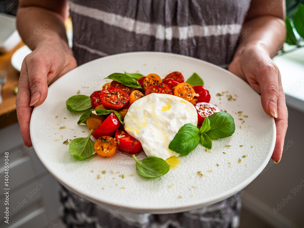 Woman holding plate with Caprese salad - tomatoes, fresh basil leaves and burrata cheese