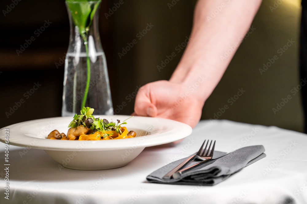 A waiter elegantly places a bowl of pasta garnished with fresh herbs and mushrooms onto a beautifully set dining table. A vase with a flower and silverware complete the sophisticated presentation