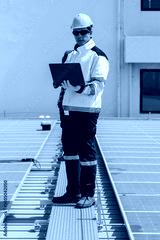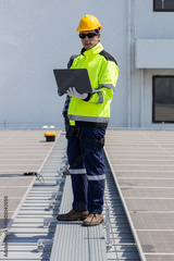 Engineer inspecting solar panels using laptop on rooftop