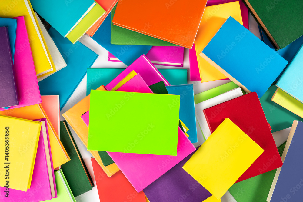 Book background. Many colorful books create texture for design. Concept of library, children's literature, textbooks for teenagers.