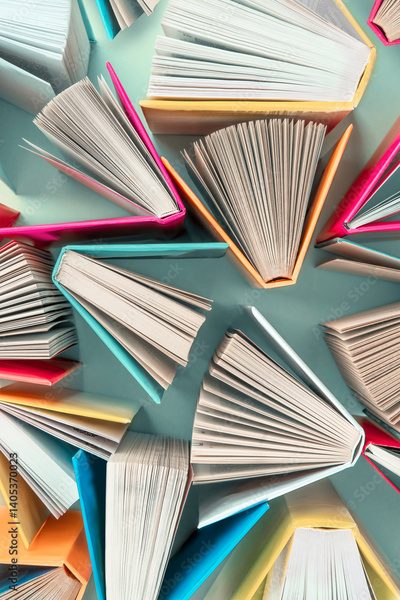 Book background. Many colorful books create texture for design. Concept of library, children's literature, textbooks for teenagers.