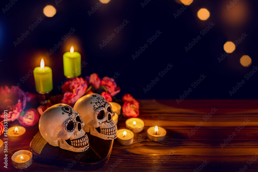 Skulls with decor for the holiday Day of the Dead. Dia de los Muertos altar surrounded by ornamented calavera, candles, flowers in the darkness. All Saints' Day evening