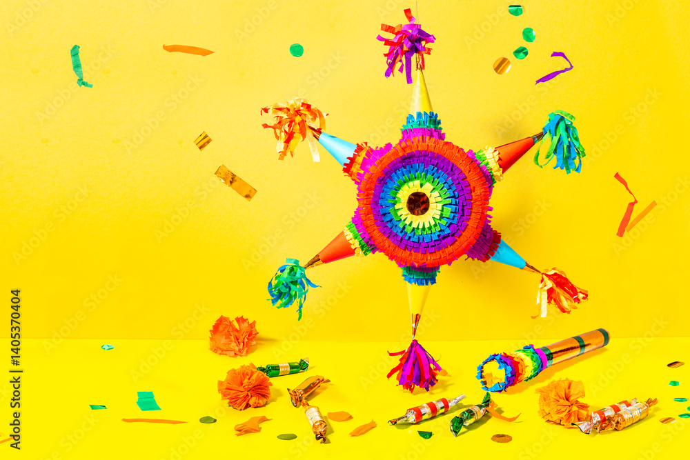 Pinata in the shape of a star on isolated background. Rainbow-colored paper handmade Piñata toy for a birthday party Mexican style.