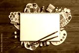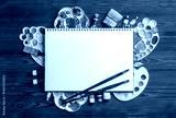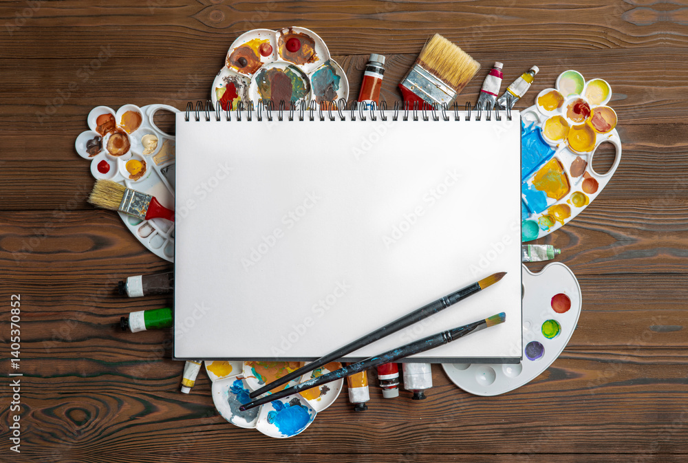 Watercolor paint in old used plastic palettes, creative mess. Album notebook with white sheets for painting. Copy space, empty blank, mock up