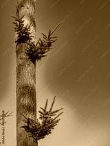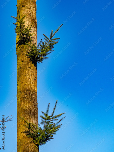 Neue Triebe am Stamm eines Nadelbaums im Frühjahr