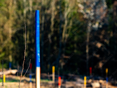 Wiederaufforstung im Frühjahr mit bunten Markierungsstöcken