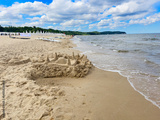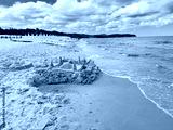 Blue sky with clouds sandcastle fortress on a tranquil beach, waves gently crashing ashore.