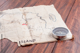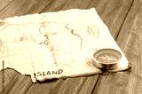 Treasure Map of fake Island with compass and red cross on wooden table background. Adventure concept