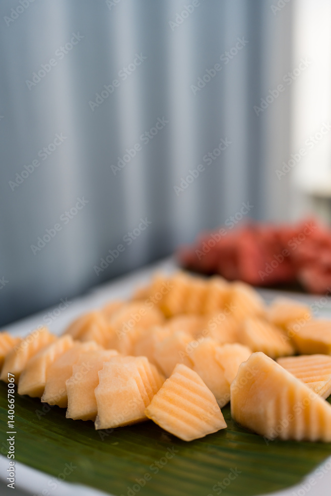 Slice of cantaloupe on banana leaf tray in buffet at hotel. Food place array in buffet line.