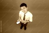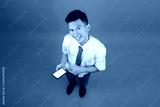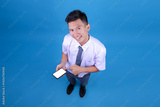 Asian Student Boy Using and Pointing a Mobile Phone with Blank White Screen