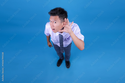 Curious and Nosy Young Student in Uniform Try to Listen Intently with Hand Over Ear Isolated on Blue Background