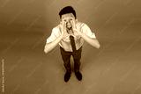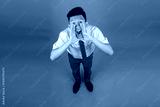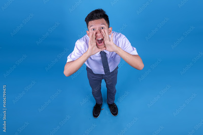 Asian Teenage Schoolboy Cupping Hands Around Mouth Shouting and Making Announcement