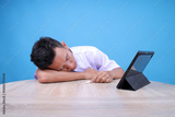 Exhausted Male Student Lying on Table and Sleeping After Hard Working Day