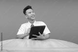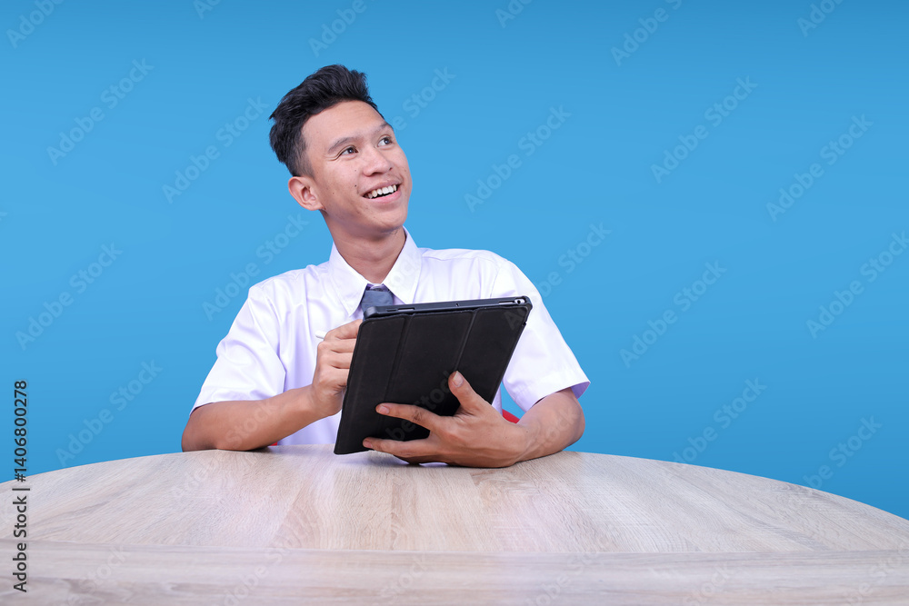 Attractive Young Student Boy Holding Digital Tablet and Looking Aside For Promo Advertising