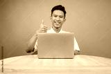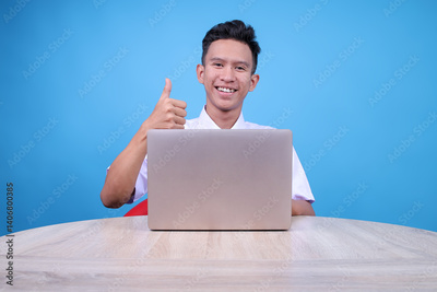 Optimistic Young Asian Male Using Laptop Computer Showing Thumb Up Gesture