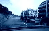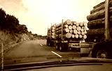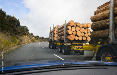 Timber logs carried by long heavy-duty truck on the winding road. North Island. New Zealand.