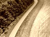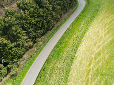 Aerial view of an empty country road in Britain. Showing a wooded area by the roadway and a arable field opposite.