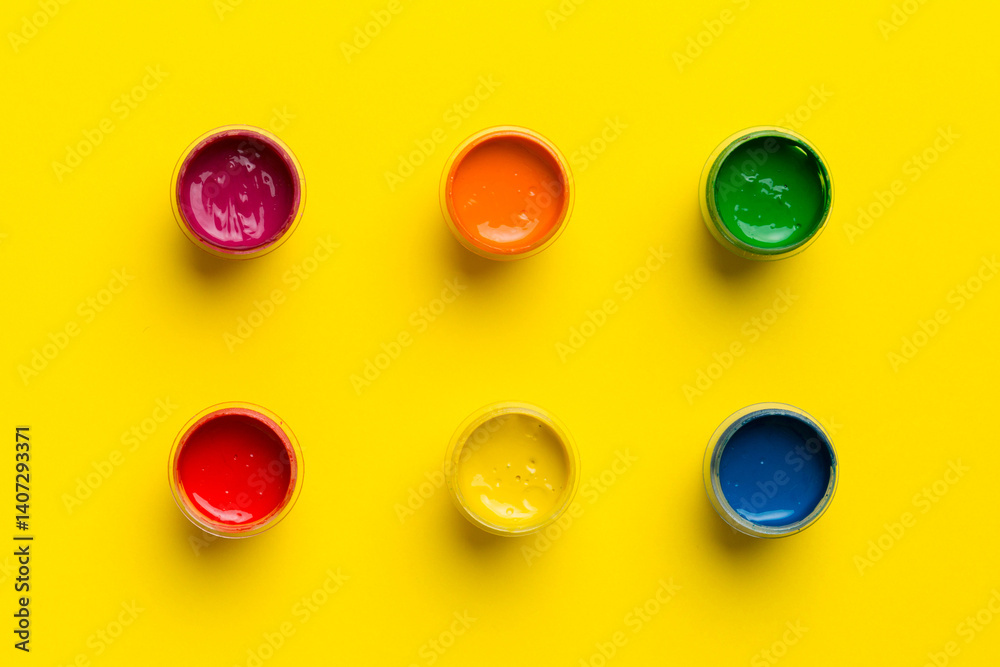 jars with gouache of different colors on Colored background. hobby painting. Top view with empty space. workplace for creativity. home teaching concept drawing
