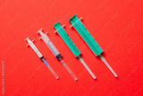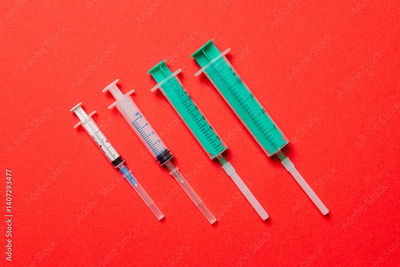Top view of medical syringes on colorful background with copy space. Injection equipment concept