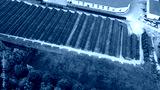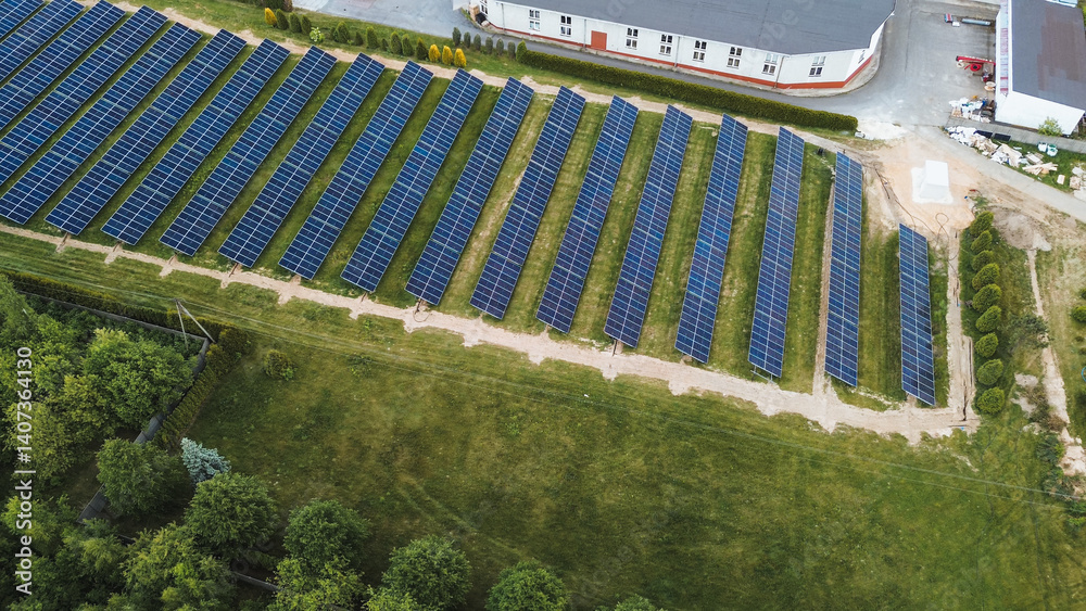 solar panel farm in green field aerial view drone footage