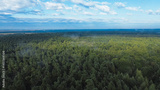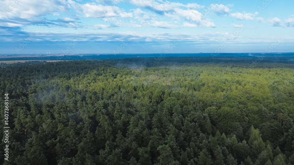 Green forest canopy covered in mist