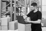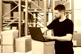 Logistics Manager Overseeing Automated Warehouse Operations with Laptop