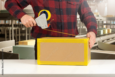 Worker sealing a cardboard box with yellow tape in a packaging facility, preparing goods for shipment – Warehouse, Logistics Center, Packaging.