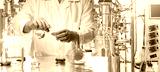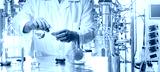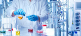 A man in protective clothing with test tubes in his hands against the background of a laboratory bioreactor.Experiments in the field of Microbiology. Pharmaceutical research.Synthesis of new chemicals