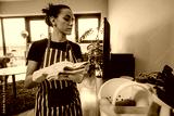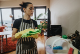 A housekeeper wearing protective gloves and an apron organizes a living space using cleaning tools, achieving cleanliness and order in a stylish modern home.