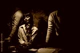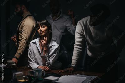 A group of professionals engage in collaborative discussion in a dimly lit office, emphasizing teamwork, contemplation, and effective management. The environment suggests focus, determination, and