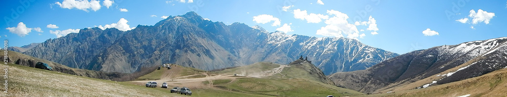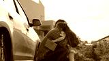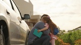 Happy family cute little daughter pupil and caring father embracing talking before primary school lesson outdoor. Smiling female kid child and dad hugging to each other going to elementary classroom