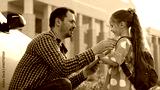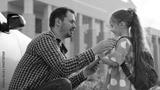 Smiling father giving textbook daughter pupil with backpack hugging before going school campus closeup. Happy dad embracing little female kid child arriving elementary education lesson at schoolyard