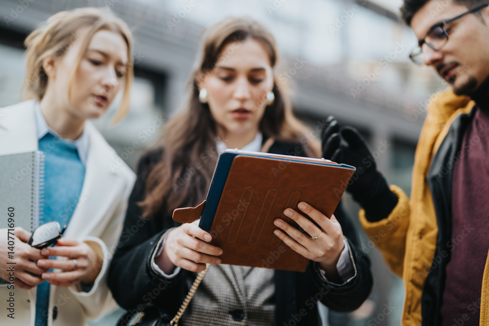 Group of young business colleagues brainstorming ideas and collaborating in a modern outdoor environment. Emphasizing teamwork and creativity for solutions in an urban work setting.