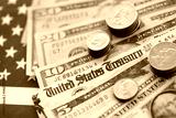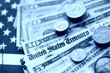 American US dollars money bills and coins with stimulus bill or refund check on American flag