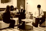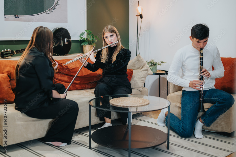 Three friends enjoy performing music in a cozy living room setting, creating a fun and creative atmosphere with their instruments while sitting comfortably amidst a warm and inviting decor.