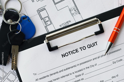 Pen and keys on Notice to quit form and planning blueprints of residential building project close up