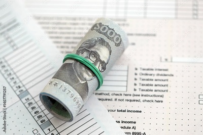 Bangladeshi taka money bills in big amount lies on table with tax forms close up
