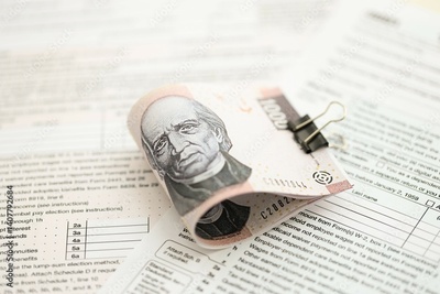 Mexican pesos money bills in big amount lies on table with tax forms close up