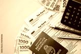 Argentine pesos money bills in big amount lies on table with pen, calculator, passport and tax forms