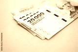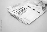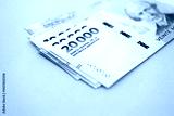Argentine pesos money bills in big amount lies on teal color table close up