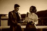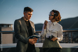Two business colleagues engage in an intense brainstorming session on a high-rise balcony at sunset, showcasing diversity and collaboration in a modern urban environment.