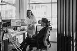 A multicultural team of business employees in an office meeting. A woman presents data on a screen to a seated colleague. The bright modern office fosters collaboration and productivity.