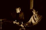 Two colleagues strategize together in a dimly lit office, focusing on project ideas and deadlines. The teamwork showcases late-night dedication and collaborative problem-solving.