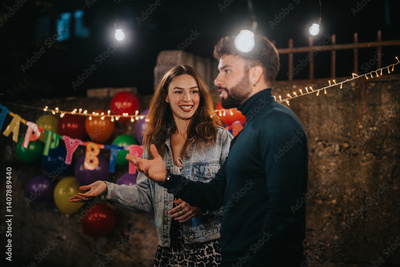 Group of friends enjoying an outdoor birthday party at night with vibrant decorations and lights.